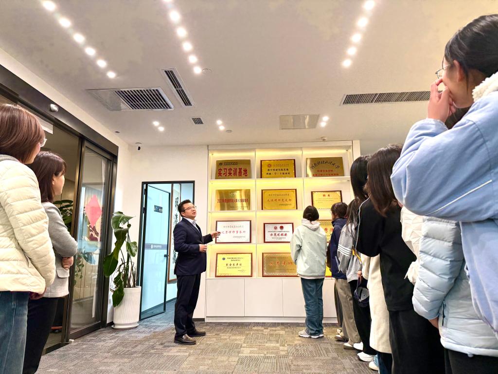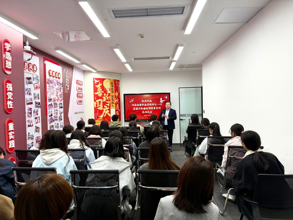 河南曲成律师事务所党支部书记、主任上官绪波以“法治实践的每一步都关乎公平正义”为起点,带领师生沿“办公区——研讨室——荣誉墙”动线深入参观。在律师办公区,新生们看到案卷按程序分类归档、法律文书逐字推敲修改,直观感受“每一份法律文件都承载当事人权益”的职业责任;在会议研讨室,上官主任结合正在办理的民事纠纷案件,讲解“如何通过证据梳理还原事实真相”,让新生理解“程序正义是实体正义的保障”;荣誉展示墙前,律所历年办理的“农民工讨薪维权”“未成年人法律援助”等典型案例,更让新生们深刻认识到:律师作为法治实践的重要力量,始终在“维护弱势群体权益、推动矛盾实质性化解”中坚守公平正义底线。